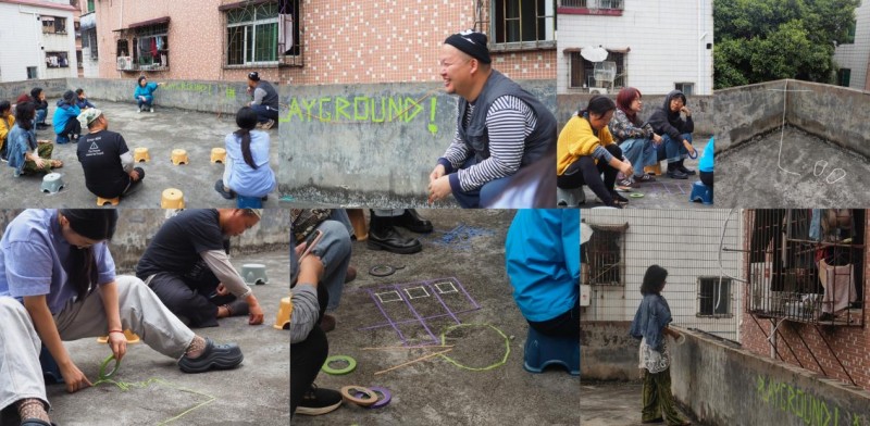 跨学科创作者设计傻瓜游戏,开展接力试玩,尝试用“玩”搭建开放对话和主动创造的契机;2025年他们以童年游戏跳格子为灵感,用胶带涂鸦临时改造公共空间,邀请附近居民参与游戏发明和试玩,尝试用“玩”编织附近关系,推动公共想象。