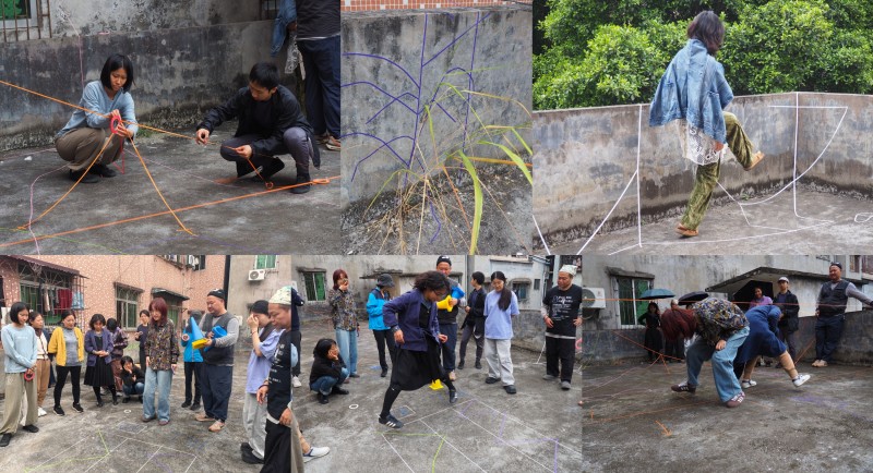 大家在天台感受着20公分不到的邻居家握手楼,它们高低错落的在身边堆叠着垒起房子方块,在这高度折叠的、即将成为时代历史的城中村里,参与者们利用地面和墙面的角度,创作出了立体多维的胶带玩法,将胶带作为语言去阐述自己对于场地的理解,并且通过互玩游戏的方式将这份理解转化为“身体性”的实践与交流。